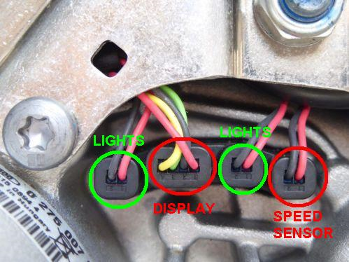 ② Rozpojit čtyřpólový konektor mezi displayem a tělem motoru (DISPLAY) a dvoupólový konektor mezi senzorem tachometru a tělem motoru (SPEED SENSOR).